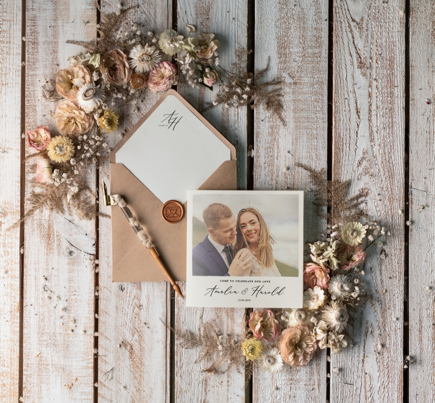 In questo periodo va molto di moda il formato polaroid per le foto, vedo che molti siti ne propongono la stampa e spesso si può aggiungere un testo in sovrimpressione. Perché quindi non sfruttare questa opportunità per creare delle partecipazioni di nozze super creative? qui sotto, in questo esempio, potete vedere la foto dei futuri sposi accompagnata da una busta con il sigillo in ceralacca.