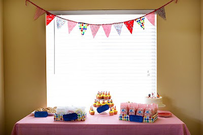 Una grande ghirlanda fatta di bandierine di stoffa abbellisce l’angolo dove è stato allestito il tavolino con i pasticcini.