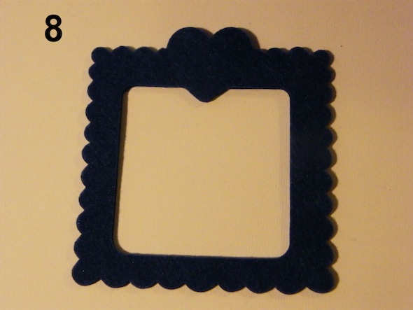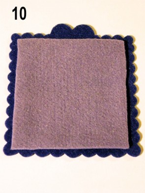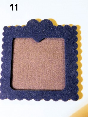 Prendete un pezzo di feltro spesso, di un altro colore, tagliate un quadrato che abbia dimensioni appena più piccole rispetto alla cornice (foto 10) e attaccatelo, con la colla a caldo, alla cornice (foto 11), fate attenzione ad incollare solo tre lati, lasciate aperto, non incollate il lato superiore dove c’è il cuore.