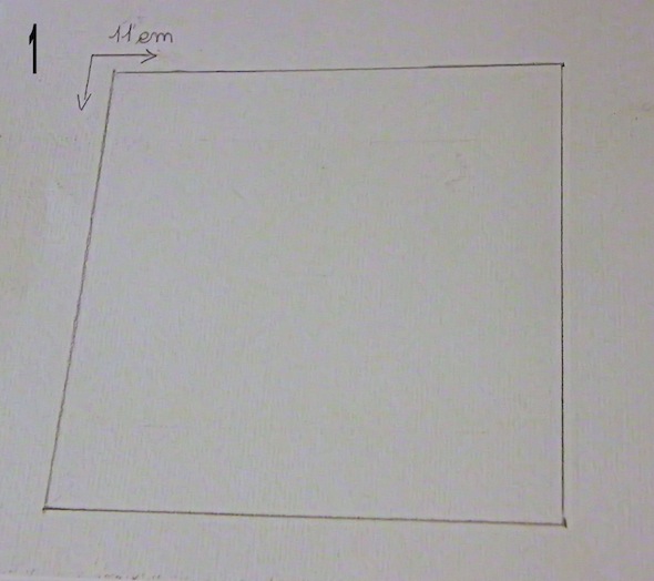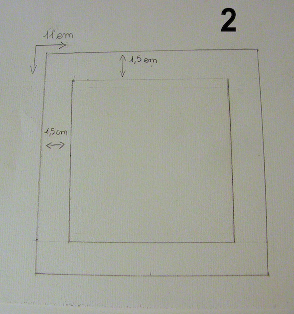 Per creare la vostra bomboniera prima comunione disegnate, per prima cosa, un quadrato 11 cm x 11 cm su un cartoncino (foto 1), all’interno del quadrato disegnate un altro quadrato, lasciando un bordo di 1,5 cm ( foto 2 ).