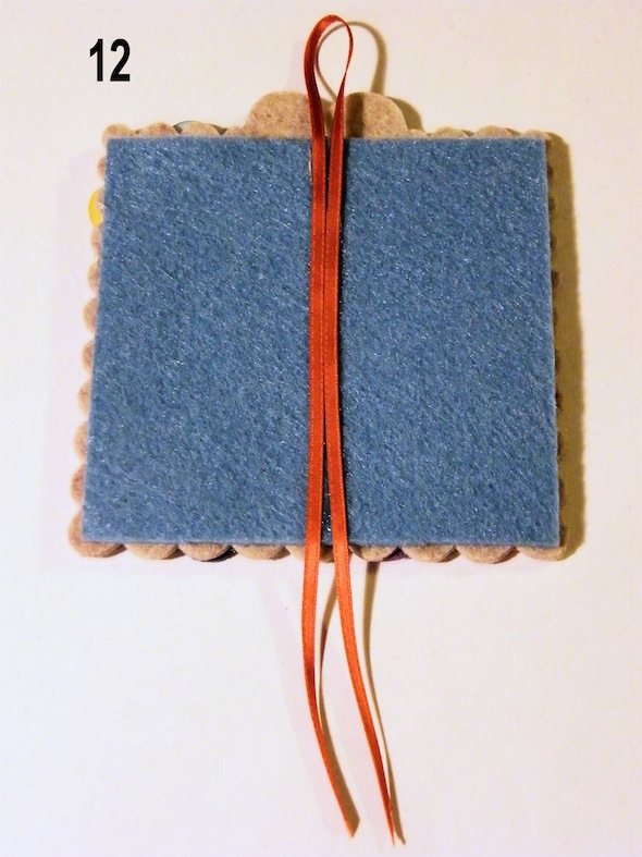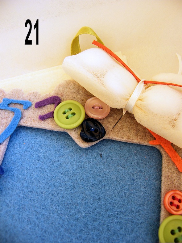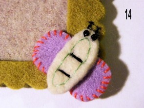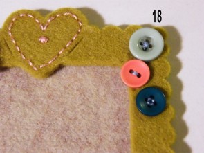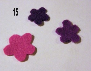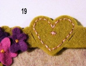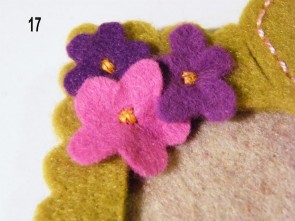 2) Ritagliate dei piccoli fiori di pannolenci e cuciteli sull’angolo opposto come da foto 16 e 17;