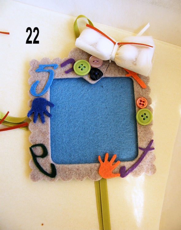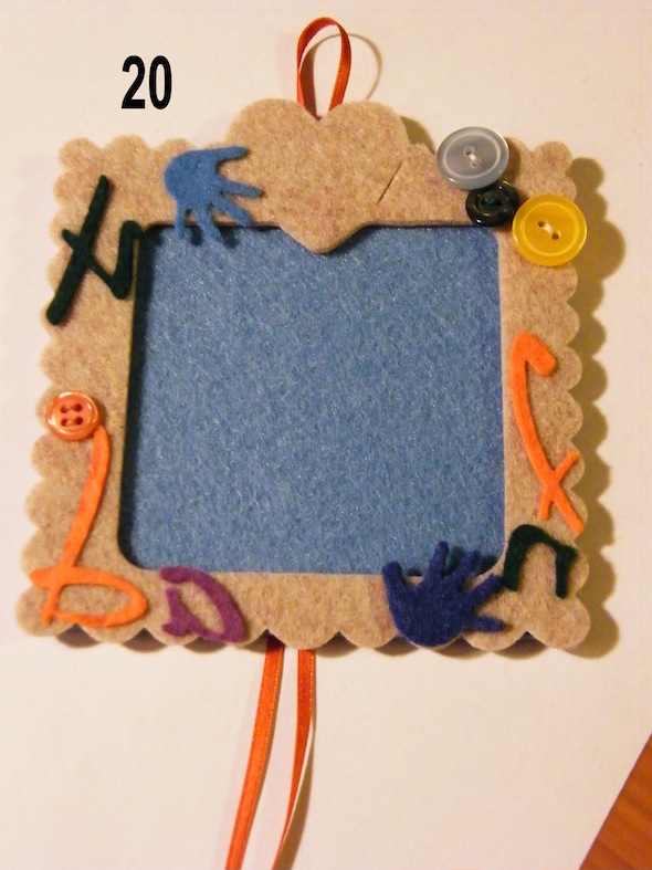 Potete decorare i portafoto come volete: per i maschietti potete aggiungere più bottoni e mettere, al posto di fiori e farfalle, qualche letterina e qualche numero come da foto 20.