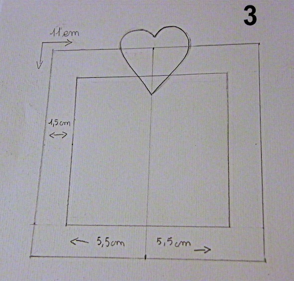 Dividete a metà il quadrato e disegnate sul bordo, in alto, un cuore come foto 3.