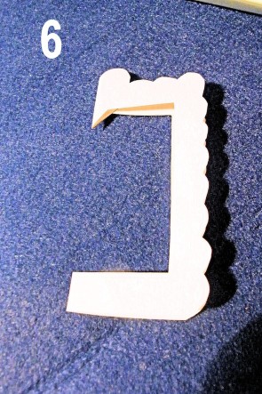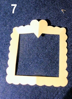 Ritagliate la cornice (foto 4), piegatela in due (foto 5) e tagliate ancora il bordo creando delle “ondine” (foto 6 e 7 ) .