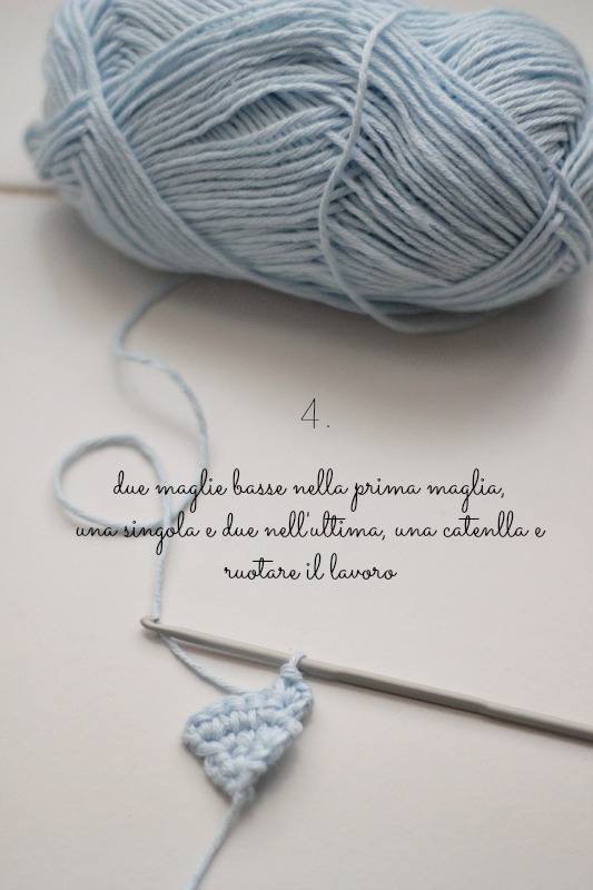 3. Nella prima maglia fate due maglie basse, ripetete, fate una catenella e ruotate il lavoro.