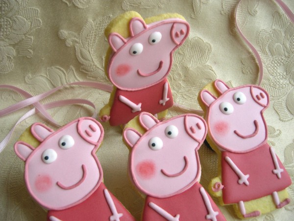 Evelindecora ha invece dato forma a dei biscotti decorati con la ghiaccia reale. Si possono creare anche senza gli stampini, basta fare la sagoma di Peppa Pig su un cartoncino e usarla come cartamodello per ritagliare la pasta frolla.
