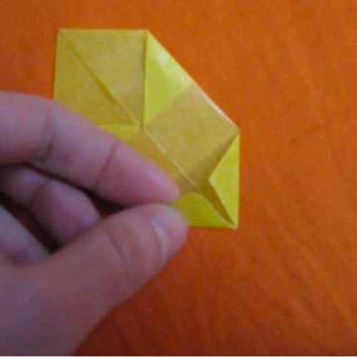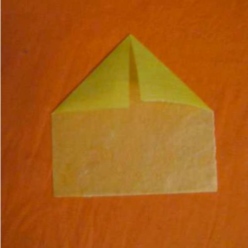 5) Piegate verso il basso due degli angoli del quadrato facendoli combaciare al centro (per facilitare questa operazione potete precedentemente piegare a metà il quadrato e usare la linea che si crea come guida).
