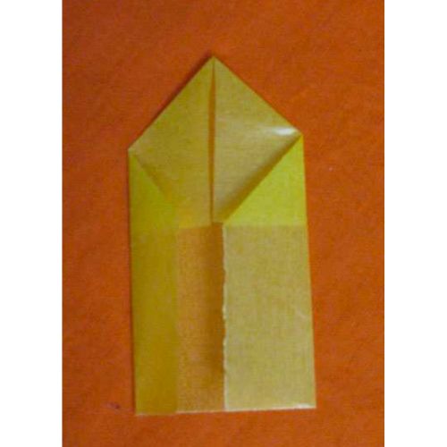 8 – Piegate i due angoli inferiori verso l’alto e allineandoli al centro come le piegature precedenti. Fissate anche questa piegatura con un puntino di colla.