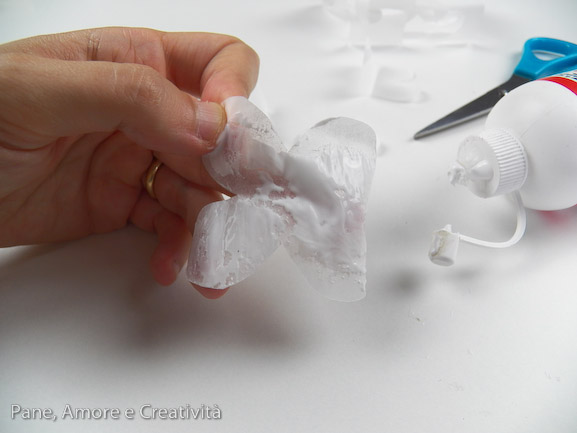 9. Piegate il filo fino a formare un occhiello, avvolgetelo su se stesso e piegate verso l’interno le ali della farfalla (mettendo un goccio di colla).