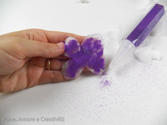 7. Spalmate un po’ di colla vinilica sulla superficie delle ali e poi decoratele con i Sabbiarelli (questo passaggio lo possono fare i bambini).
