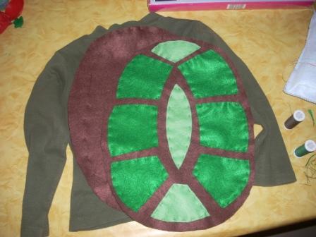 Ho ritagliato due ovali dal pannolenci marrone e due dal pannolenci beige. Su quello marrone ho cucito dei ritagli di pannolenci verde e per quello beige ho usato dei ritagli gialli. La parte senza ritagli è stata cucita direttamente su una maglietta verde, una a formare il dorso, l’altra la pancia della tartaruga. Poi ho unito a ciascuna la sua metà cucendola con punto festone e con all’interno l’imbottitura sintetica per cuscini. Ho ritagliato le pinne e ho seguito lo stesso procedimento, lasciando però senza imbottitura la parte che non aderisce alle braccia. Su un cappellino verde ho cucito il viso della tartaruga. Per finire, visto che mia figlia adora il film d’animazione “Le avventure di Sammy” ho dipinto con le tempere il simbolo della pace sul suo dorso.