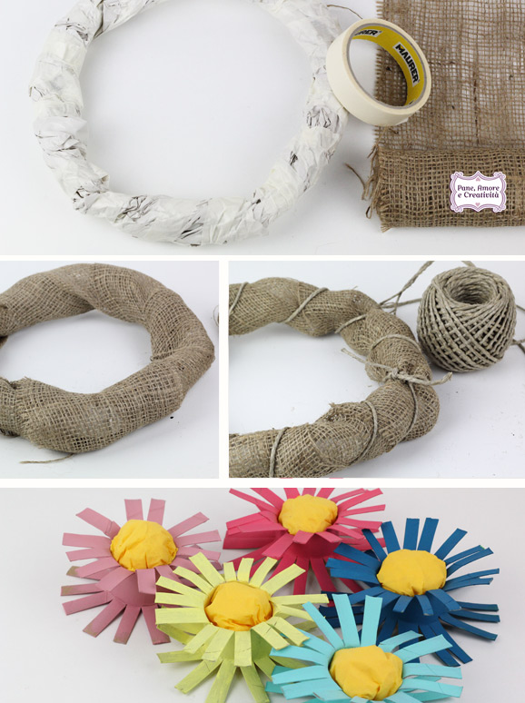 9-10. Ricoprite la base della ghirlanda con la juta e poi fermatela con lo spago.