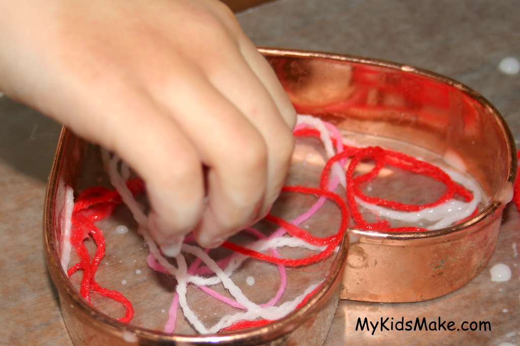 Metti il filo coperto di colla in un taglia-biscotti a forma di cuore. Quindi ripeti fino a quando il taglia-biscotti non sarà pieno di filo.
