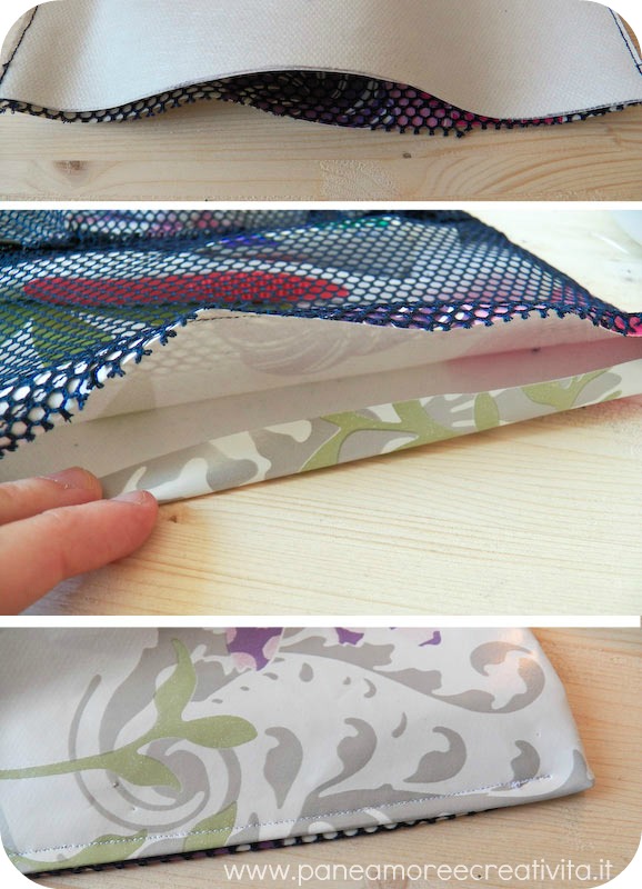 4. Una volta uniti i due pezzi di rete, cuciteli sul pezzo plastificato. Seguite il tratteggio disegnato nel disegno.