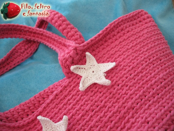 La sua borsa rosa non ha bisogno di manici e si presta per essere decorata come più vi piace. Lei ha scelto delle stelle marine, ma voi potrete anche aggiungere pesciolini all’uncinetto, fiori…perle, tutto quello che la fantasia vi suggerisce! Ora vi lascio però al progetto di Barbara, che ringrazio tantissimo!