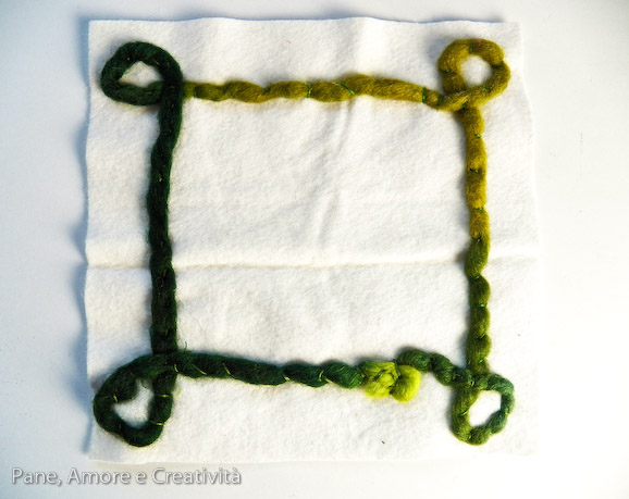 Sul feltro bianco applicate il cordoncino verde con un filo in tinta.